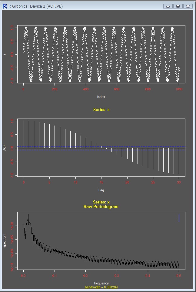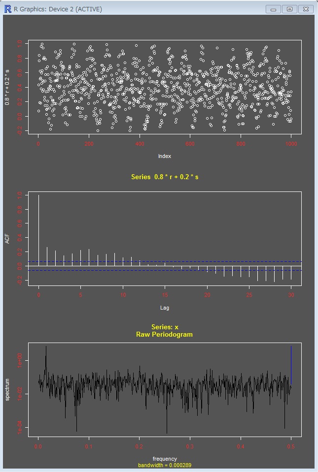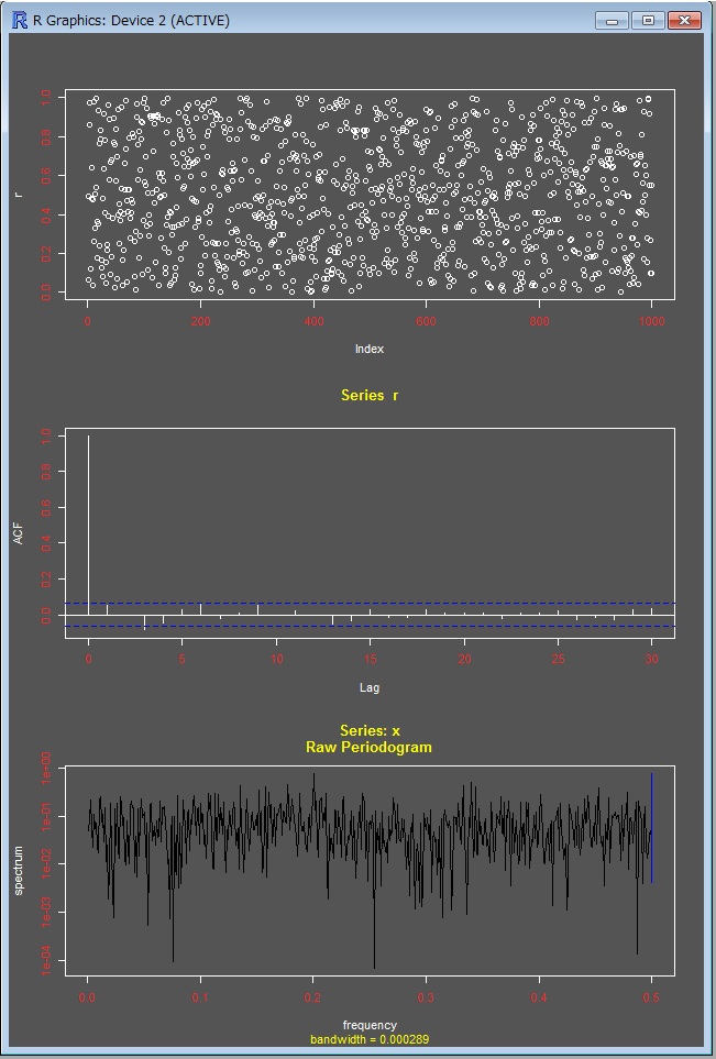 ランダムなデータ、規則性のあるデータ、そしてこれらを混ぜたデータで、自己相関、スペクトルのテストをしてみました。