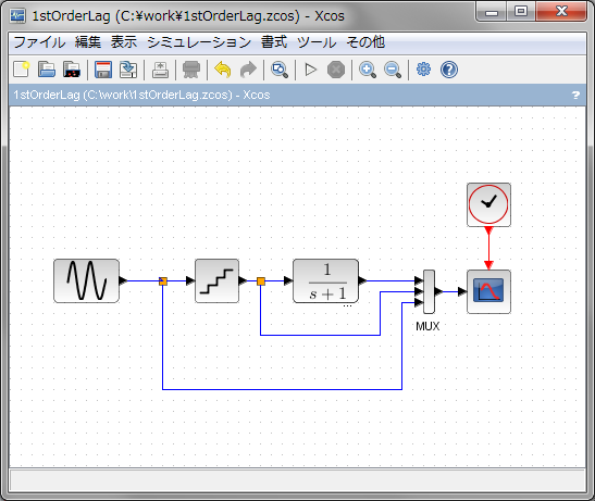 ScilabからXcosというアプリケーションを立ち上げると、MatlabのSimulinkに相当するモデルベースデザインができる環境になります。パレットブラウザからブロックをドラッグ&ドロップして、これらを線でつないでいきます。