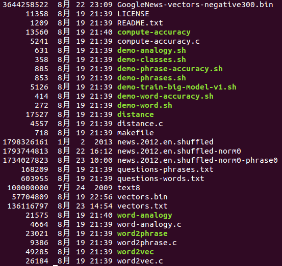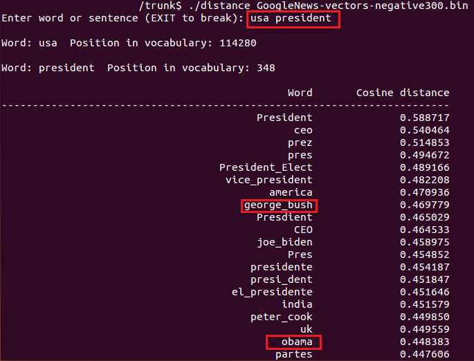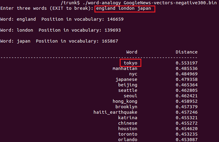 ツールを使って、近い距離にある単語を出力してみます。vectors.binではあまり十分な結果が得られなかったので、word2vecのサイトにあった、GoogleNews-vectors-negative300.bin を使いました。