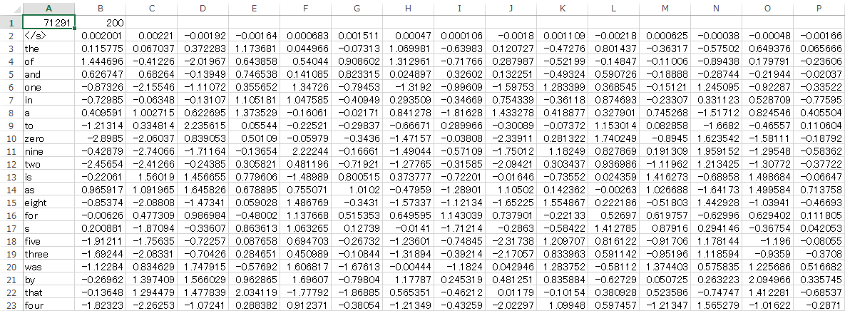 見やすくするためにExcelに表示しました。200次元のベクトルになっています。