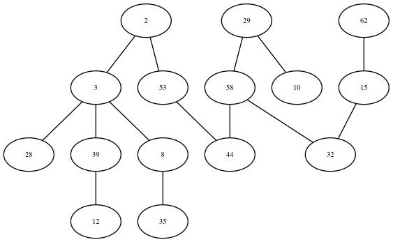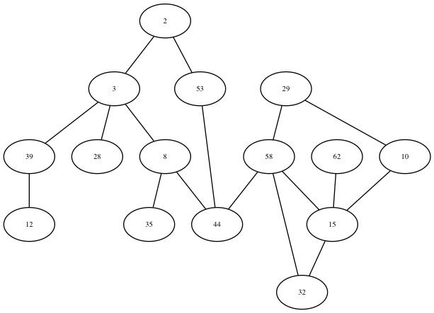 require 'rgl/base' require 'rgl/adjacency' require 'rgl/dijkstra' require 'rgl/dot' graph = RGL::AdjacencyGraph[2,53, 2,3, 3,8, 3,28, 3,39, 29,58, 8,35, 12,39, 10,29, 62,15, 15,32, 32,58, 58,44, 44,53] graph.write_to_graphic_file(fmt='jpg', dotfile='dijk') p graph.dijkstra_shortest_path(Hash.new(1), 39, 62) |