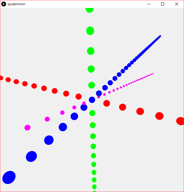 import peasy.*; PeasyCam cam; int SZ = 600; void setup(){ size(600, 600, P3D); cam = new PeasyCam(this, 100); cam.setMinimumDistance(50); cam.setMaximumDistance(500); } void draw(){ background(240); for(int i=0;i<60;i++){ pushMatrix(); translate(i*10 - 300, SZ/2 - 300, SZ/2 -300); noStroke(); fill(255,0,0); sphere(2); popMatrix(); } for(int i=0;i<60;i++){ pushMatrix(); translate(SZ/2-300, i*10-300, SZ/2-300); noStroke(); fill(0,255,0); sphere(2); popMatrix(); } for(int i=0;i<60;i++){ pushMatrix(); translate(SZ/2-300, SZ/2-300, i*10-300); noStroke(); fill(0,0,255); sphere(2); popMatrix(); } pushMatrix(); translate(150, 150, 150); noStroke(); fill(0,255,255); sphere(4); popMatrix(); for(int i=0;i<60;i++){ pushMatrix(); Quaternion q = new Quaternion(); q.setAngleAxis(radians(15), new PVector(1, 0, 0)); PVector r = new PVector(SZ/2-300, SZ/2-300, i*10-300); PVector m = q.mult(r); translate(m.x, m.y, m.z); noStroke(); fill(255,0,255); sphere(1); popMatrix(); } } |