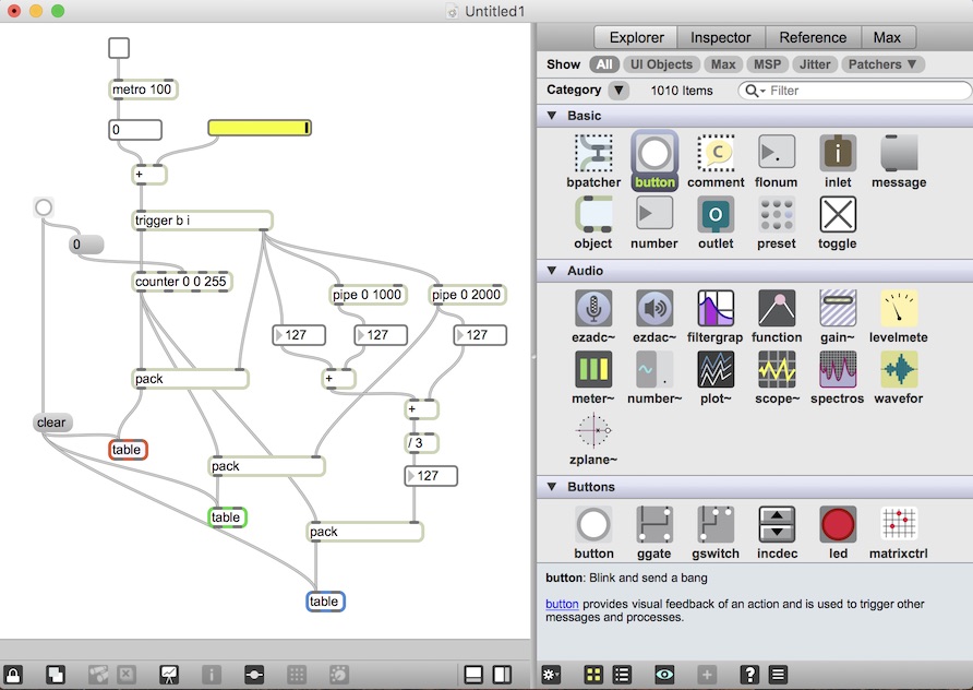 このMax、本来は音楽のシーケンスデータをプログラミングするツールなのですが、作曲ツールだけあって時間軸を操作するツールが数多くあります。古くからちょくちょく愛用しているアプリですが最近また使いたい題材があったため、トレーニングのため取り上げてみました。これは有料アプリなので、類似アプリとしてフリーのPureDataやvvvvもよく使われます。