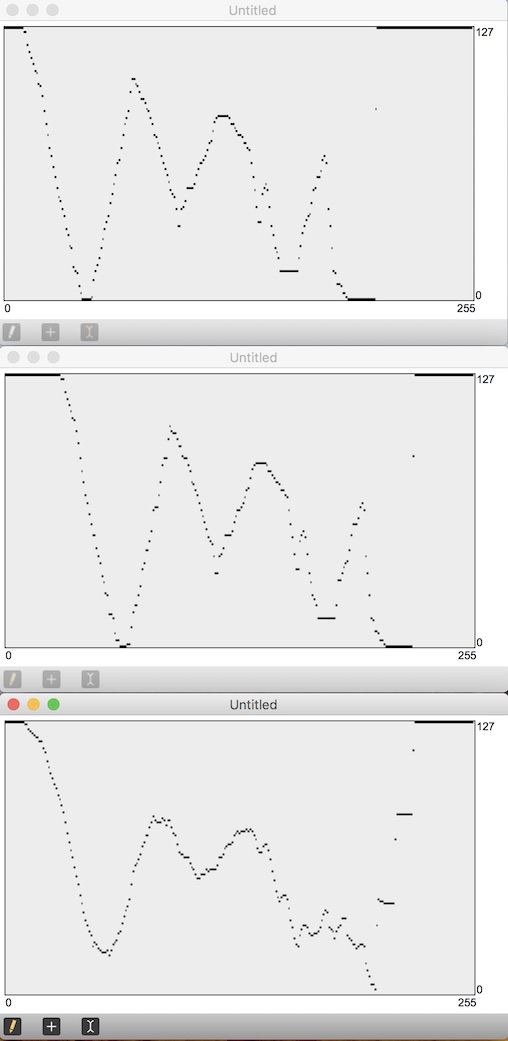 metroオプジェクトがプログラムを100ms単位で起動し、マウスで手動で操作したスライダ(黄色)の値をtableオブジェクトに格納しています。pipeオブジェクトで1000ms, 2000ms遅らしたデータを作り、3つのデータの平均もtableに格納しています。