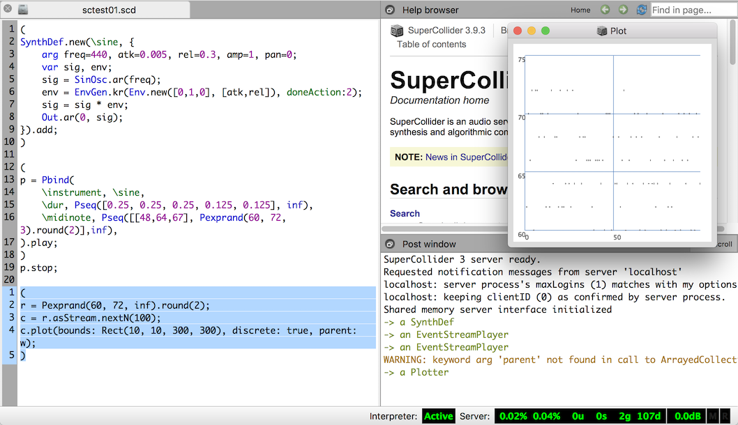 最初のブロックで、音色を定義します(シンセサイザ(音響合成)部分)。波形の種類、時間による音のボリューム変化値(エンベロープ)を与えます。Macではcommand+Enterキーで範囲指定した部分を実行します。