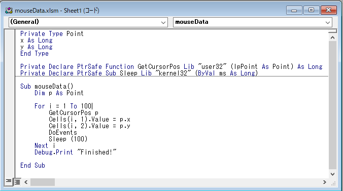 プログラムは、マウスカーソルのX座標をA列、Y座標をB列に100ms間隔で記録していきます。