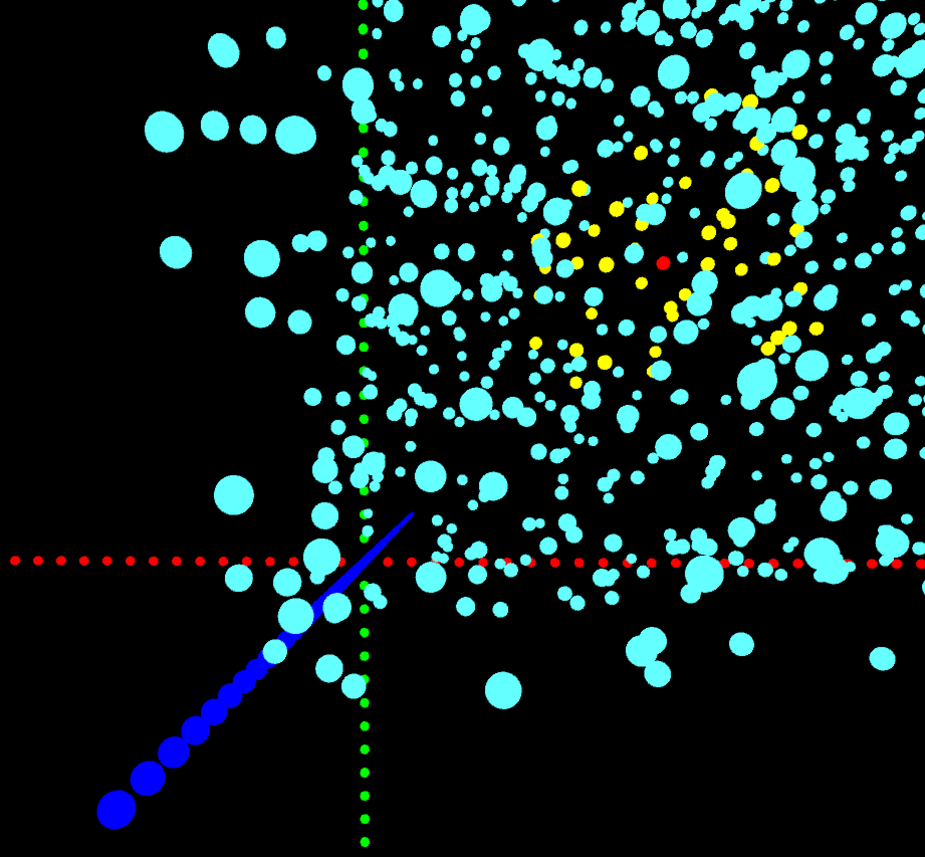 右上手前の事象にランダムな点を描画し、そのうちの赤点px,py,pzからの距離が50のものを黄色で表示しました。