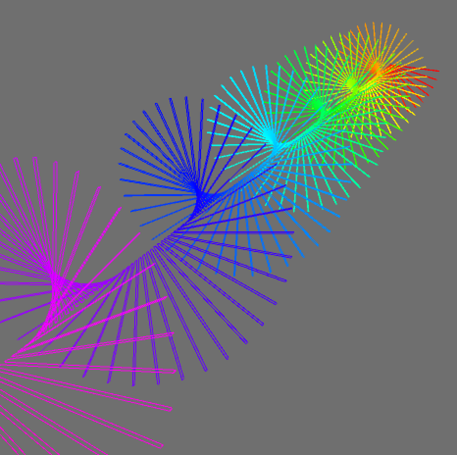 import peasy.*; PeasyCam camera; PVector v; int yaw = 0; int roll = 0; void setup() { size(1200, 1200, P3D); camera = new PeasyCam(this, 0, 0, 0, 1000); } void draw() { background(111); colorMode(HSB); v = new PVector(0, 0, 0); yaw = 0; roll = 0; pushMatrix(); for(int i=0;i<255;i++){ rollAngle(10); stroke(i, 255, 255); forward(5); yawAngle(90); forward(200); yawAngle(-90); forward(5); yawAngle(-90); forward(200); yawAngle(90); } popMatrix(); } void yawAngle (float a) { yaw += a; } void rollAngle (float a) { roll += a; } void forward( float len ) { float psi = radians(yaw); float phi = radians(roll); PVector prev = v.copy(); v.x =prev.x+ len * cos(phi) * sin(psi); v.y =prev.y+ len * sin(phi) * sin(psi); v.z =prev.z+ len * cos(psi); line (prev.x, prev.y, prev.z, v.x, v.y, v.z) ; } |