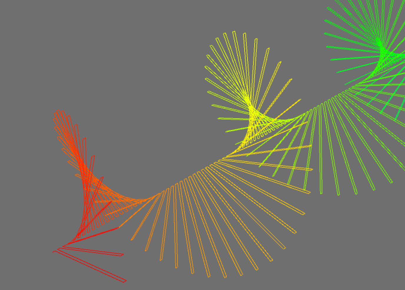 ロールで傾けて、ヨーで向きを変えて、これを繰り返していますが、動きをわかりやすくするためラインの色を赤から順に変化させています。