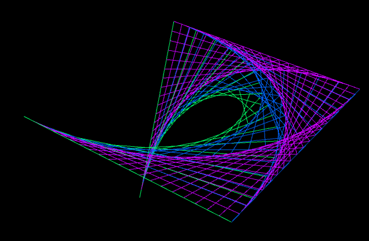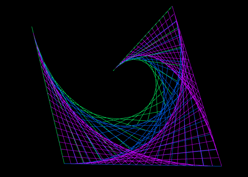 import peasy.*; PeasyCam cam; PVector[] pt = new PVector[5]; int step = 20; void setup(){ size(800, 800, P3D); colorMode(HSB, 1); cam = new PeasyCam(this, 800); pt[0] = new PVector(0, 0, 0); pt[1] = new PVector(width, 0, 400); pt[2] = new PVector(width, height, 0); pt[3] = new PVector(0, height, 400); pt[4] = new PVector(0, 0, 800); } void draw(){ background(0); for(int i=0;i<=step;i++){ PVector[] mp = pt; while(mp.length > 1){ PVector[] vt = new PVector[mp.length-1]; for (int m=0; m<mp.length-1; m++){ vt[m] = PVector.sub(mp[m+1],mp[m]); vt[m].mult(float(i) / float(step)); vt[m].add(mp[m]); } stroke(float(vt.length) / float(pt.length), 1, 1, 1); for (int n=0; n<vt.length-1; n++){ strokeWeight(1); line(vt[n].x, vt[n].y, vt[n].z, vt[n+1].x, vt[n+1].y, vt[n+1].z); } mp = vt; } } } |