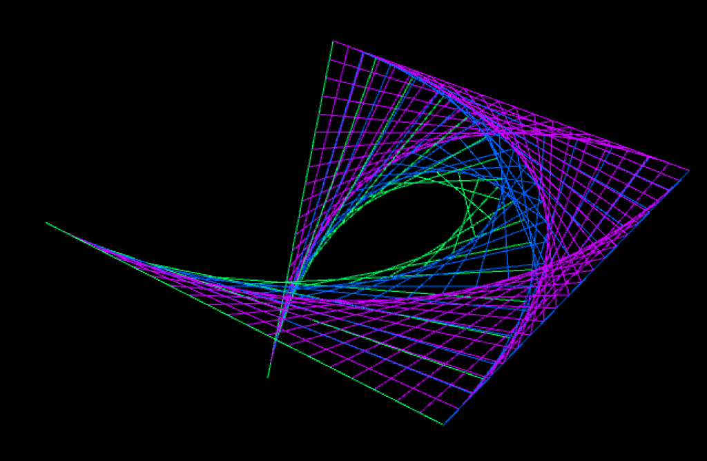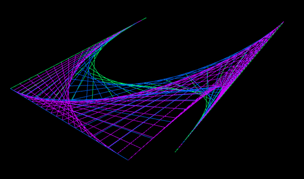 ベジエ曲線というと、3点以上の点を結んだ線分を等分した点を、さらに結んだ線から作る曲線ですが、コンピュータグラフィックによく使われます。平面上に曲線を描くことが多いですが、ここでは3D空間に描き、それをさまざまな角度から眺めてみたいと思います。