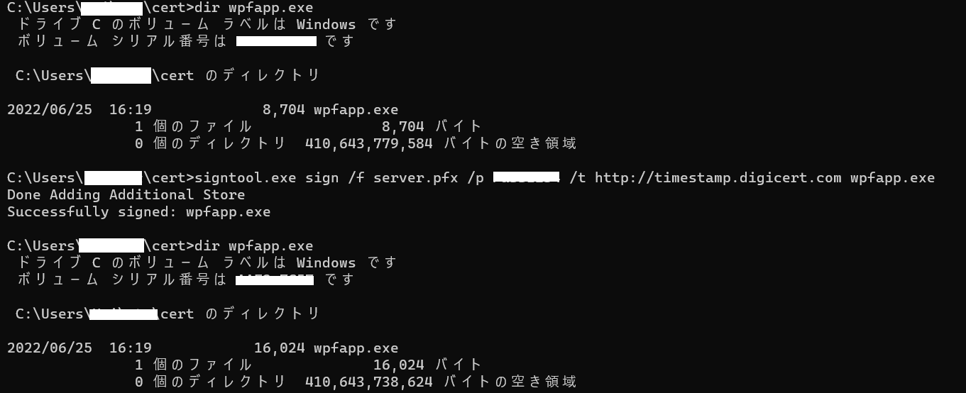 次に、signtoolを使ってアプリ(何も表示しないWpfアプリ)に署名します。(Windows DOS)