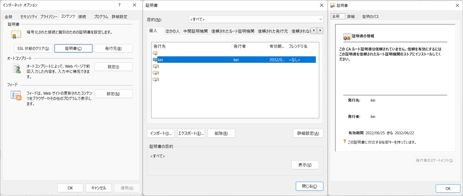 作成した秘密キー(server.pfx)がIEで読めるかImportしてみる。