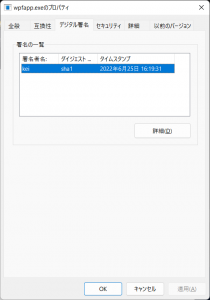 「デジタル署名」のタブは、アプリを署名すると表示されます。
