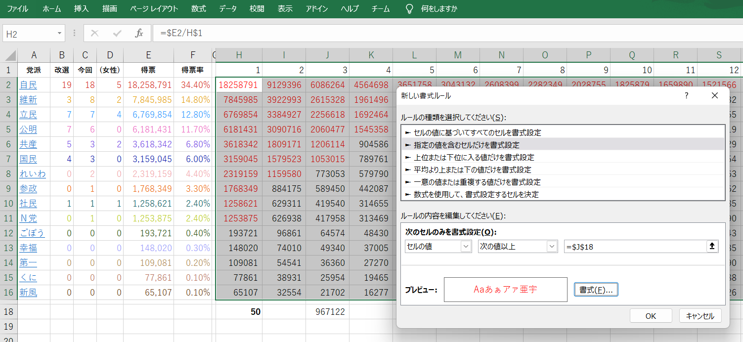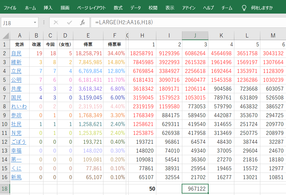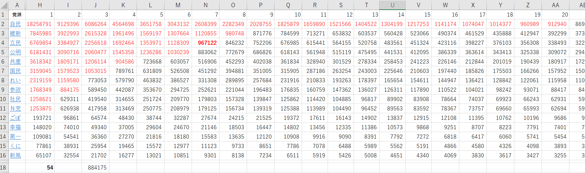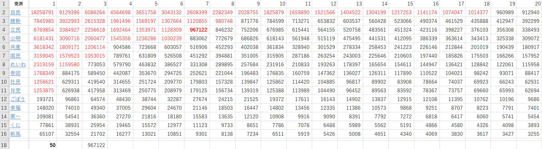 すべての計算結果から、議員定数である50を大きい順に50位までマーク(赤)して、それらがの個数が政党の獲得する議席となります。