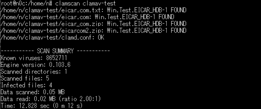 clamav-testというフォルダに格納してコマンド実行してみました。