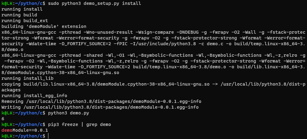 from distutils.core import setup, Extension setup(name = 'demoModule', version = '0.0.1', \ ext_modules = [Extension('demoModule', ['demo.c'])]) |