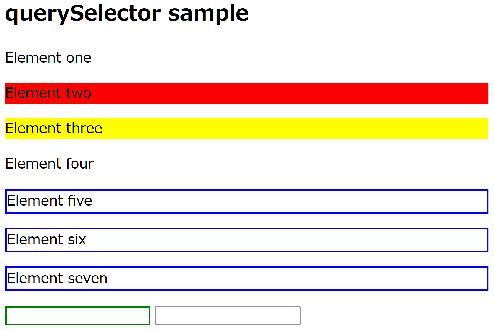 <!DOCTYPE html> <html> <body> <h2>querySelector sample</h2> <p>Element one</p> <p>Element two</p> <p class='c1'>Element three</p> <p>Element four</p> <p>Element five</p> <p>Element six</p> <p>Element seven</p> <div> <input name='user' /> <input name='pass' /> </div> <script> const l1 = document.querySelectorAll("p"); l1[1].style.backgroundColor = "red"; const l2 = document.querySelectorAll("p.c1"); l2[0].style.backgroundColor = "yellow"; const l3 = document.querySelectorAll("p"); for(i=4; i<l3.length; i++){ l3[i].style.border = "2px solid blue"; } const el = document.querySelector("div input[name='user']"); el.style.border = "2px solid green"; </script> </body> </html> |