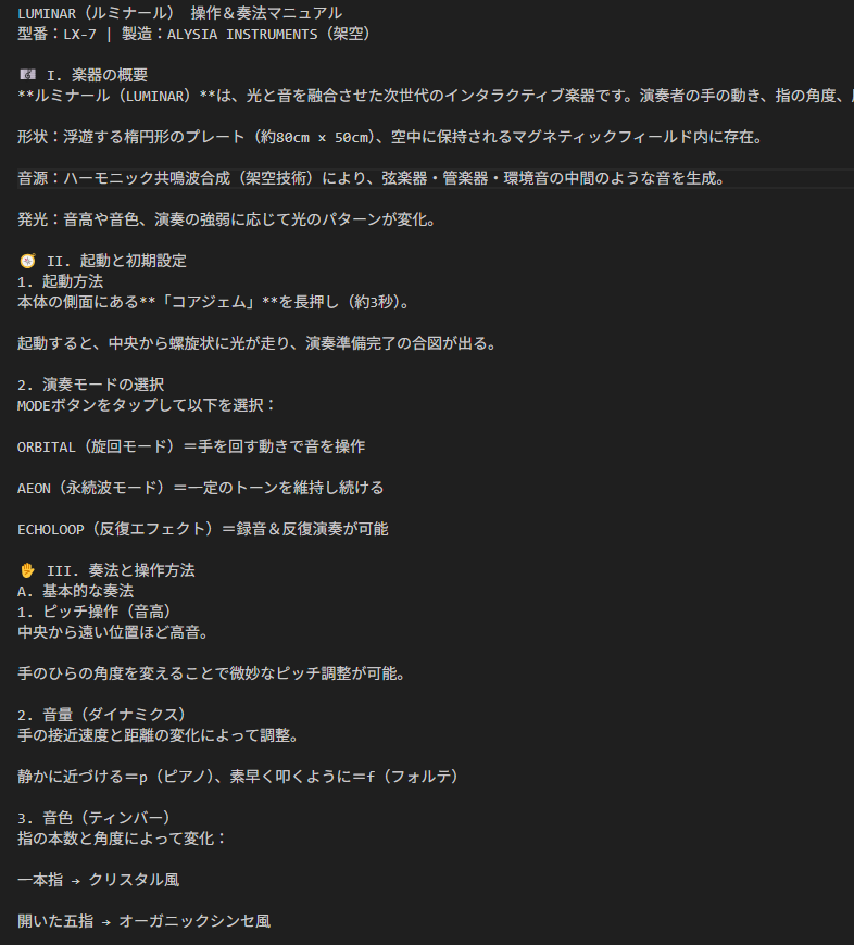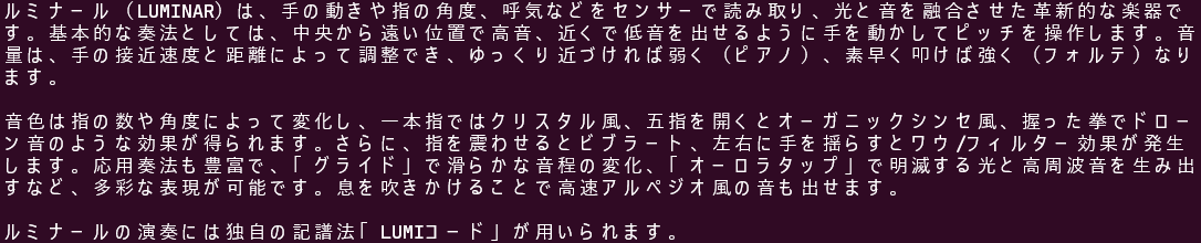 入力テキストはChatGPTで生成した、架空の楽器にまつわる架空の話にしました。