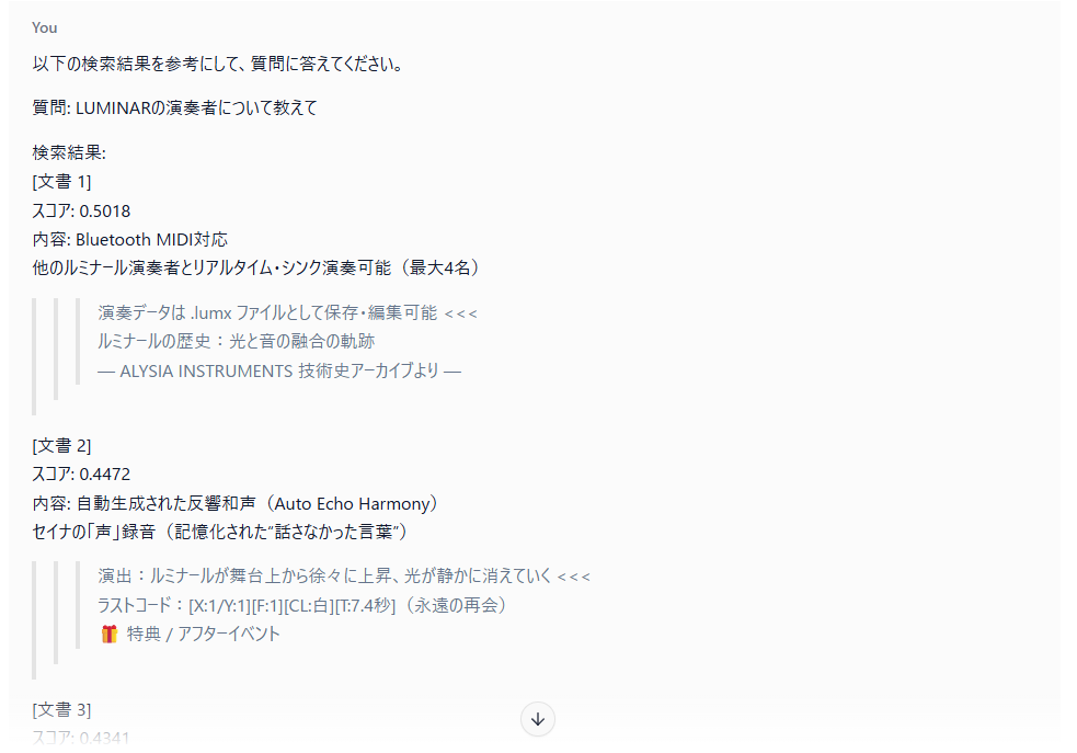 検索結果をLLMの質問に付加して、これをLM Studio(GPT-OSS-20B)のプロンプトに入力しました。