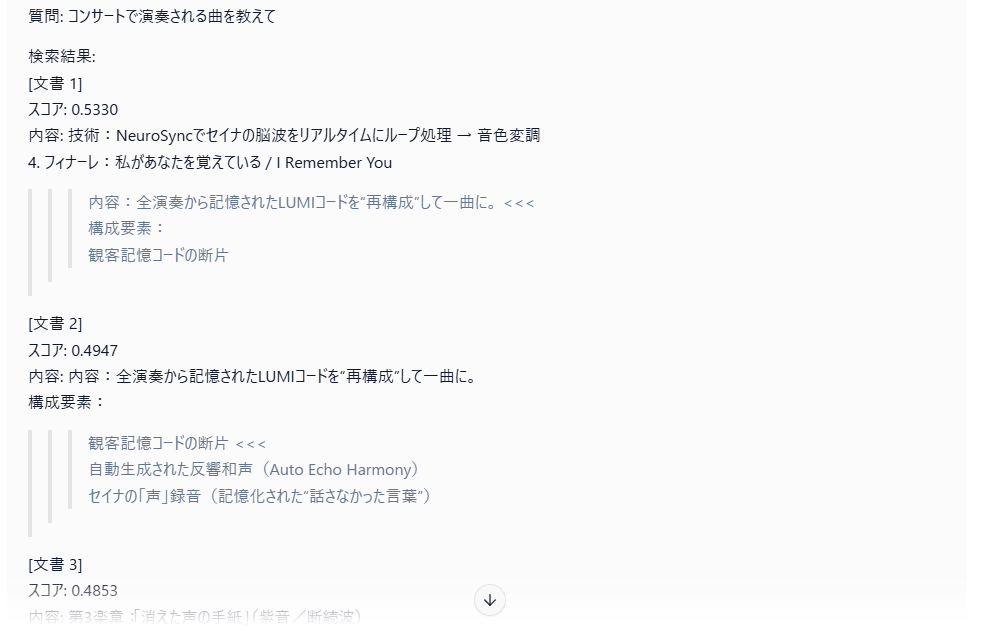 上記でもつかった架空の楽器についてかかれたテキストに対して、ベクトル検索、キーワード検索をします。