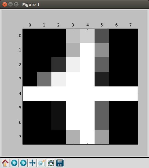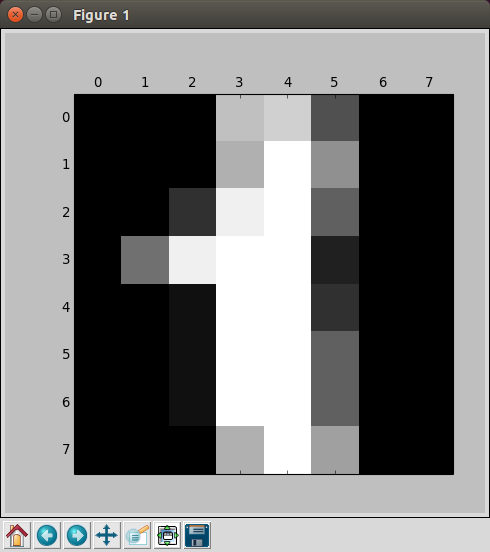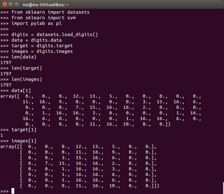 テストには、ライブラりの手書きサンプルデータを利用します。上のように1797セットのデータがありdata、imagesが学習用ビットマップデータ、targetが教師用データになります。dataとimagesは共用体(?)になっているようです。imagesは表示用に使います。