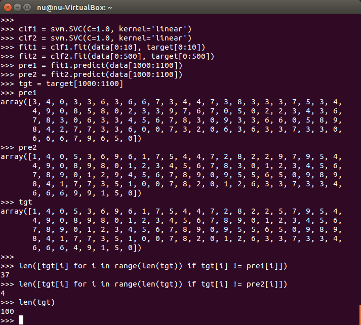 SVMという線形分類機を使い学習(fit)し、予測(predict)しました。