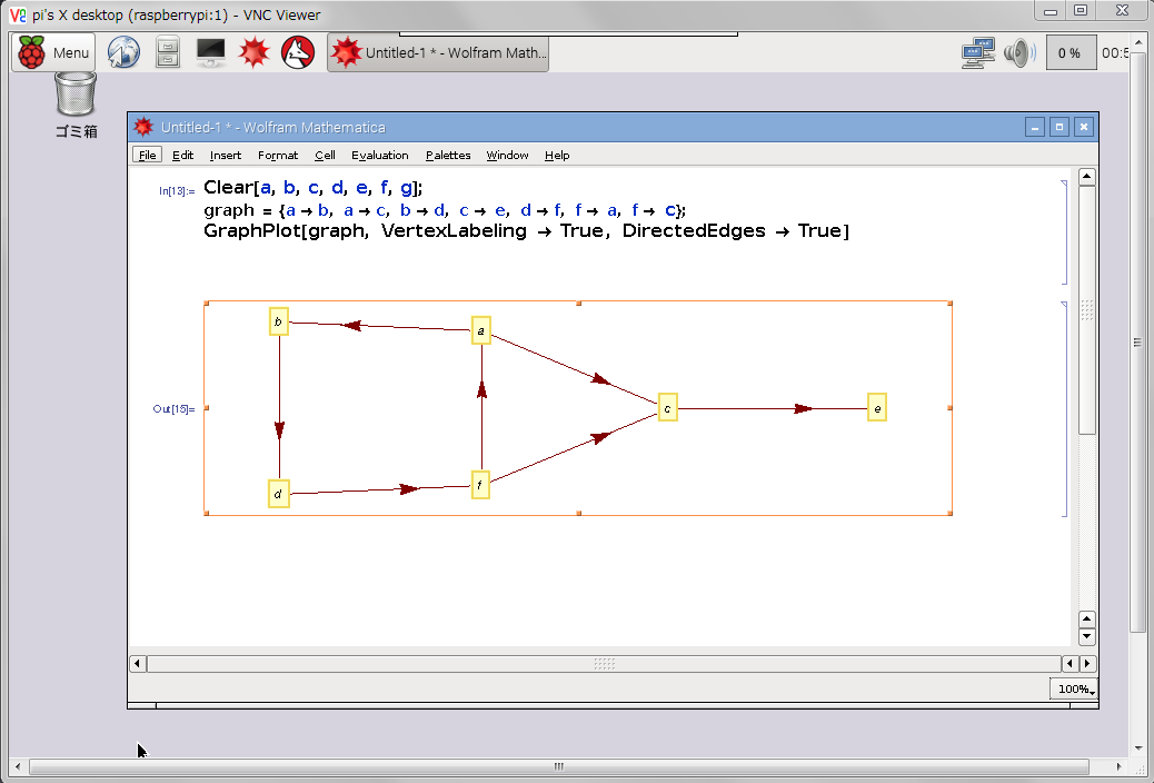 コードを入力してから、評価(Evaluation)をすると、’In[]=’,’Out[]=’、およびグラフを数秒かからないくらいで表示します。In[]=を変更して再び評価するとグラフをリドローします。グラフは自動的に見やすいようにレイアウトしてくれます。矢印は、-> と入力すると自動的に変換されます。