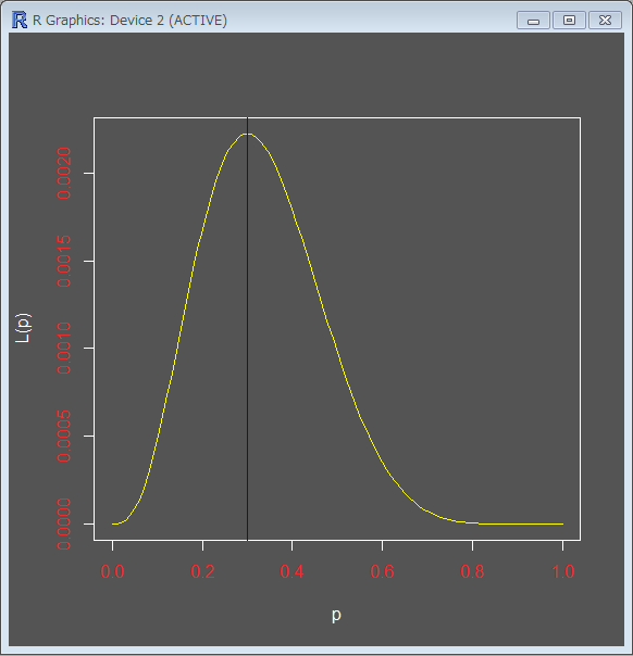 尤度関数が最大となる0.3が表がでる確率を表しています。