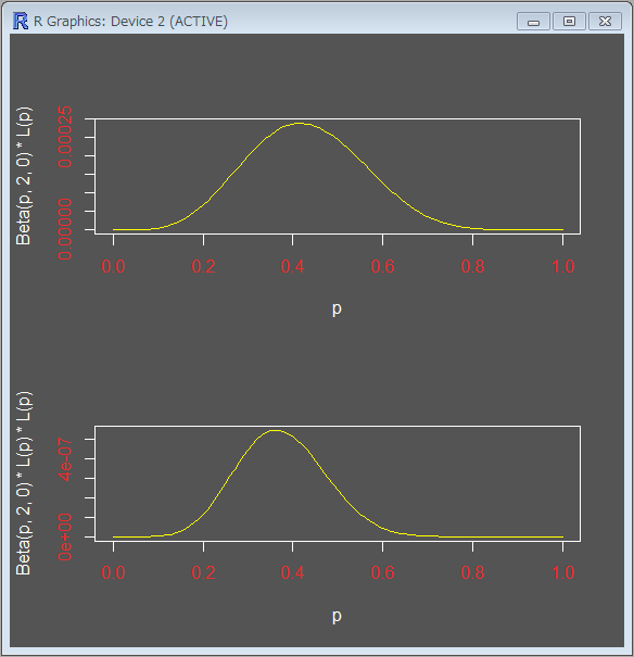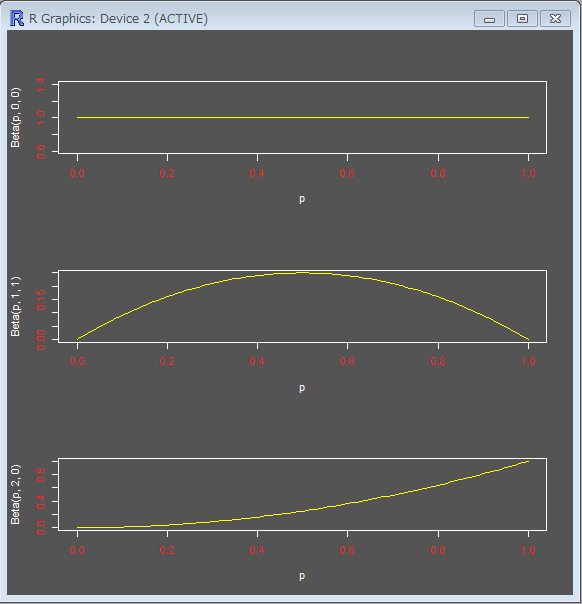 Beta関数の第二引数、第三引数は、上の例で言えば、表が出た回数と裏が出た回数に相当します。