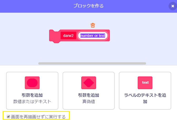 draw1とdraw2の違いは、ブロックを作るときに「画面を再描画せずに実行する」をチェックすることです。