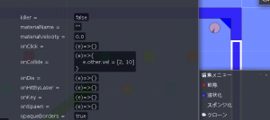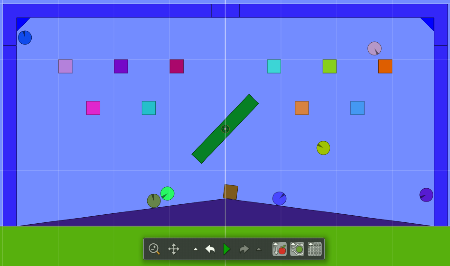 作ったシーンは、四角に閉じた箱の中に、箱中央上部をクリックすることでCircleが生成、落下し、箱の両端にCircleが到達すると、半重力によりCircleが上に駆け上がります。Circleはこのように循環しますが、床にある唯一の茶色のBoxに触ると、Circleが消滅します。中央にあるシーソーは、中央のみ固定されていて、Circleの衝突により自由に回転します。