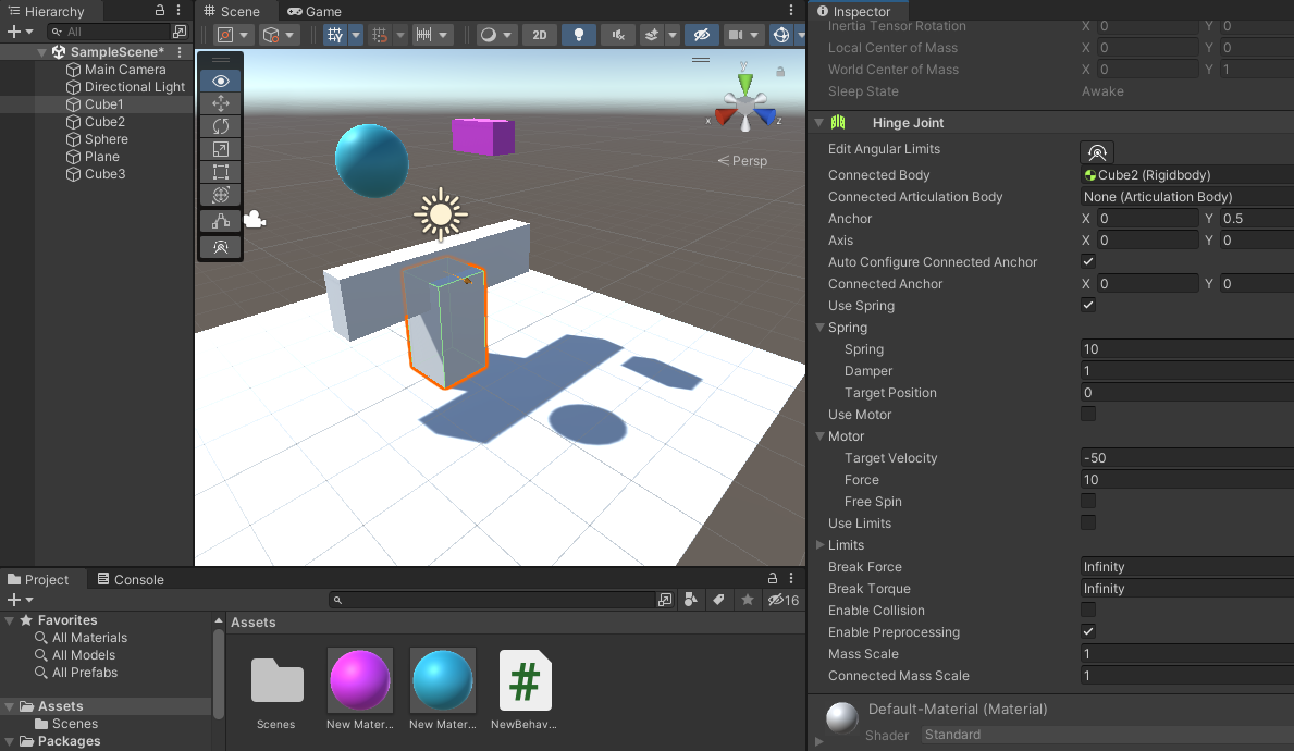 Algodooのときのようにプログラミングなしに、当たった対象を動かそう(バネのように跳ね返るとか・・)と思いいろいろと調べたところ、Hinge Joinがイメージに近いと思い、下記サイトを参考にさせていただき動かしてみました。(この「プログラミングなし」というのか今回のポイントです。バネもいいのですが、Hinge Jointの方が汎用性があるように感じました)