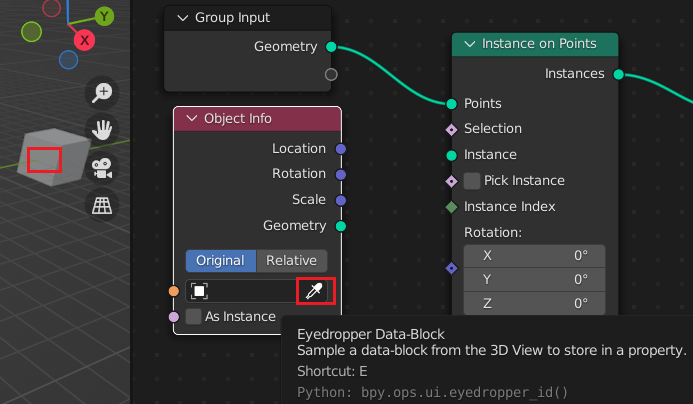 Object InfoとCubeの結び付けは、スポイトマーク(?) をクリックして、次に左のCubeをクリック