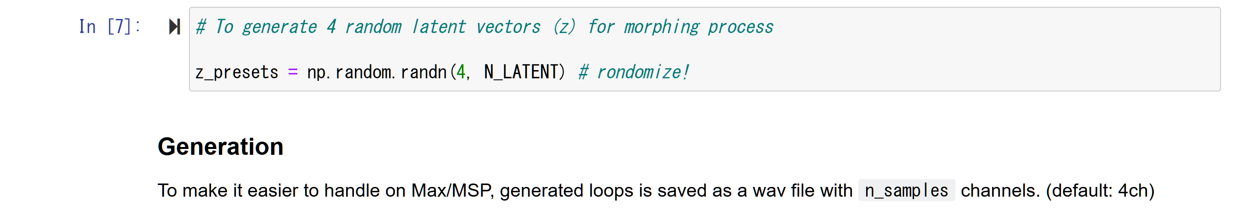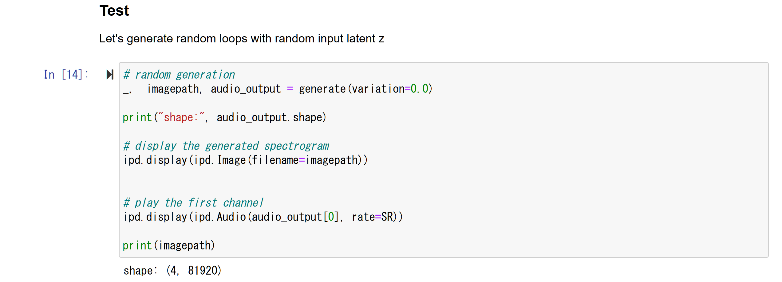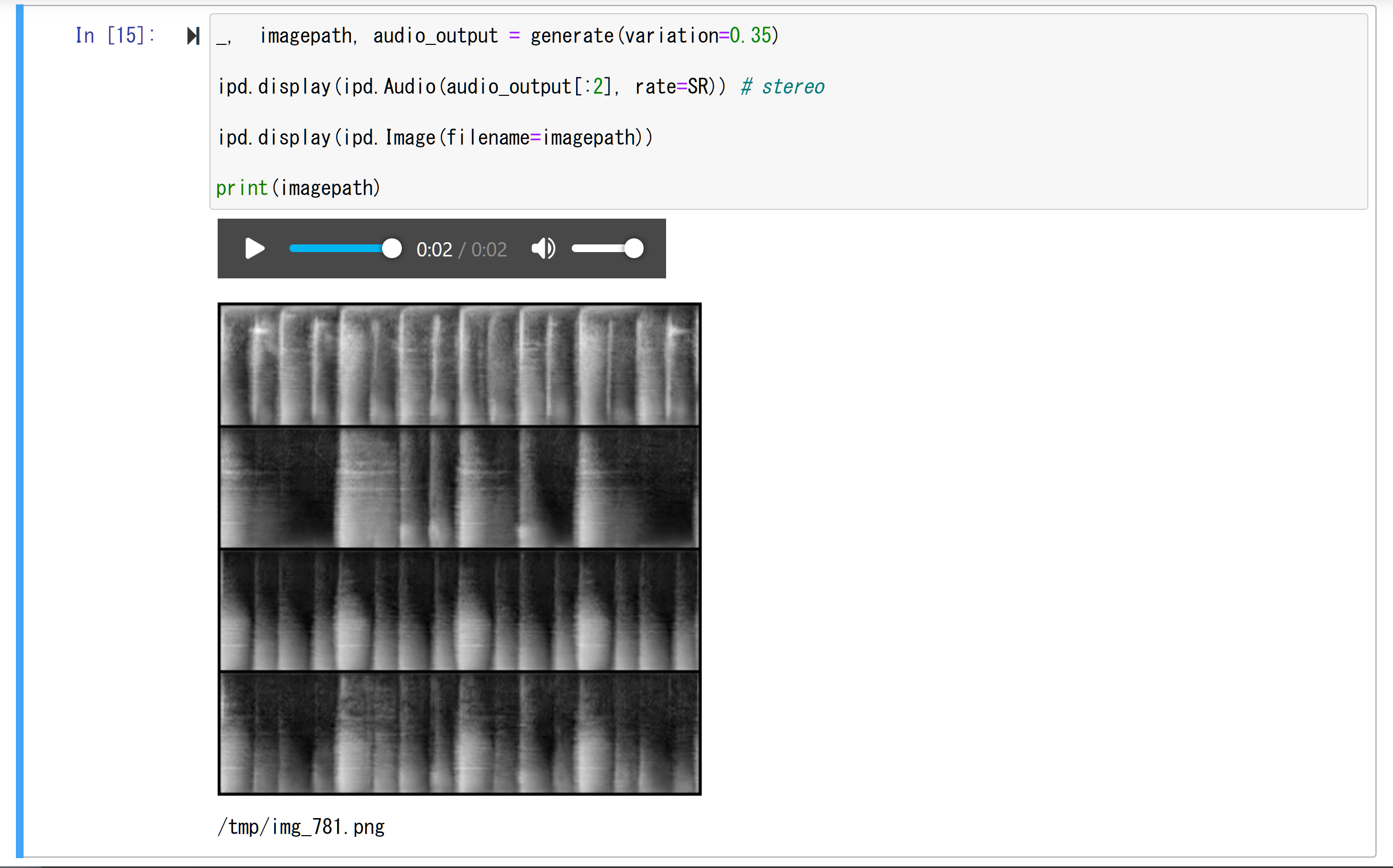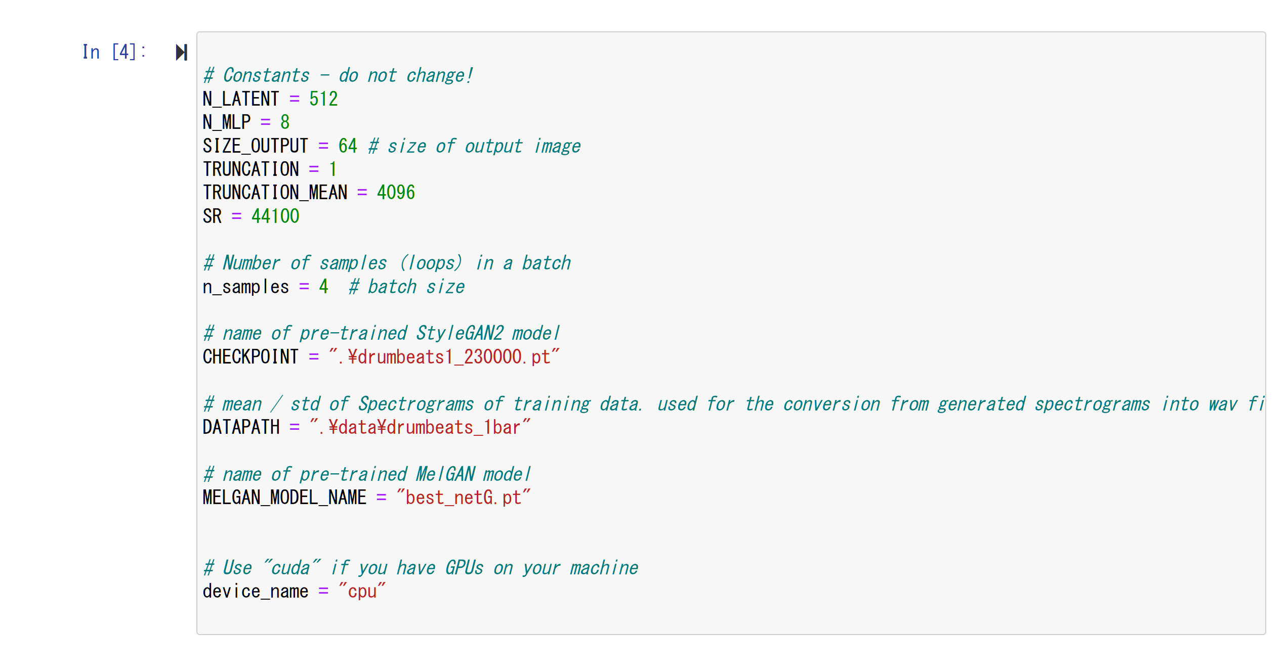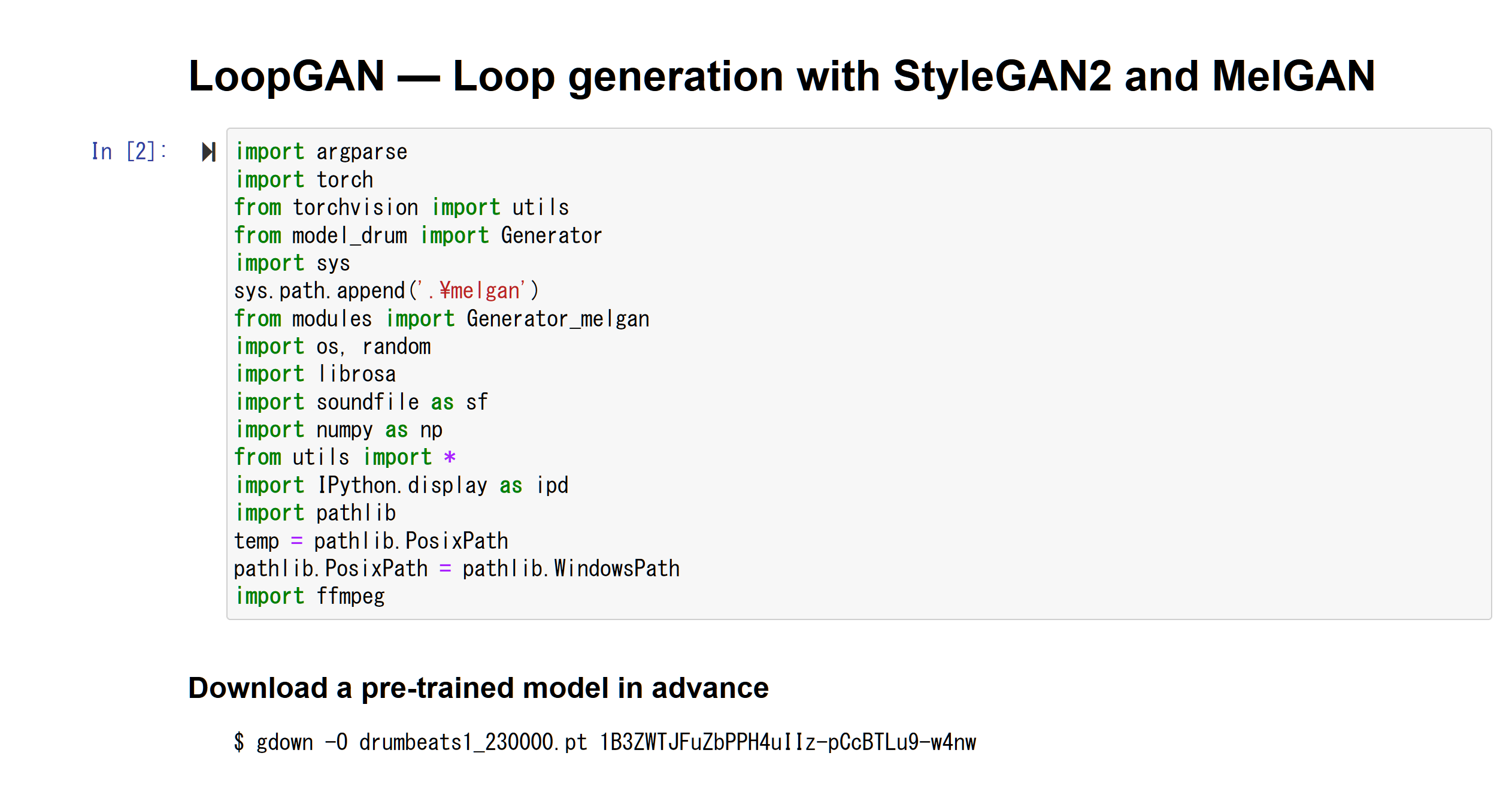 それはGAN(Generative Adversarial Networks:敵対的生成ネットワーク)というディープラーニングの学習方法です。下記に学習済モデルをつかって様々なリズムループを生み出すPythonプログラミングがあり、これを実際に動かしてみました。