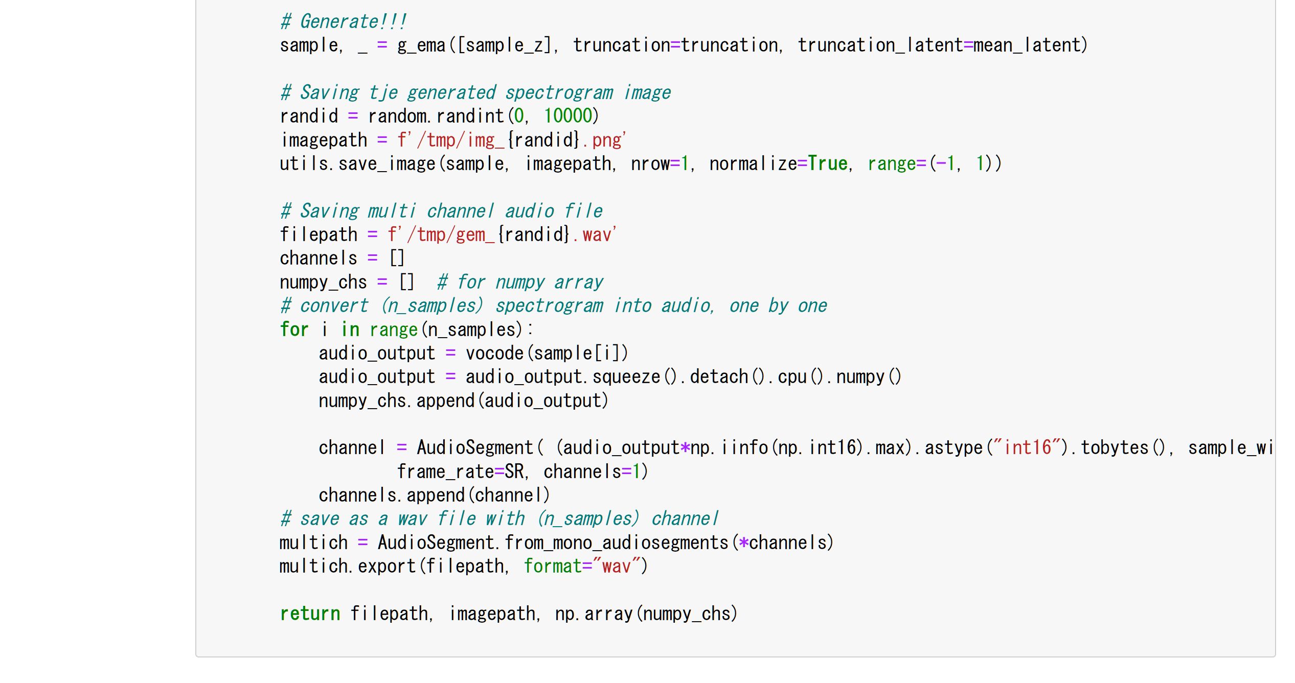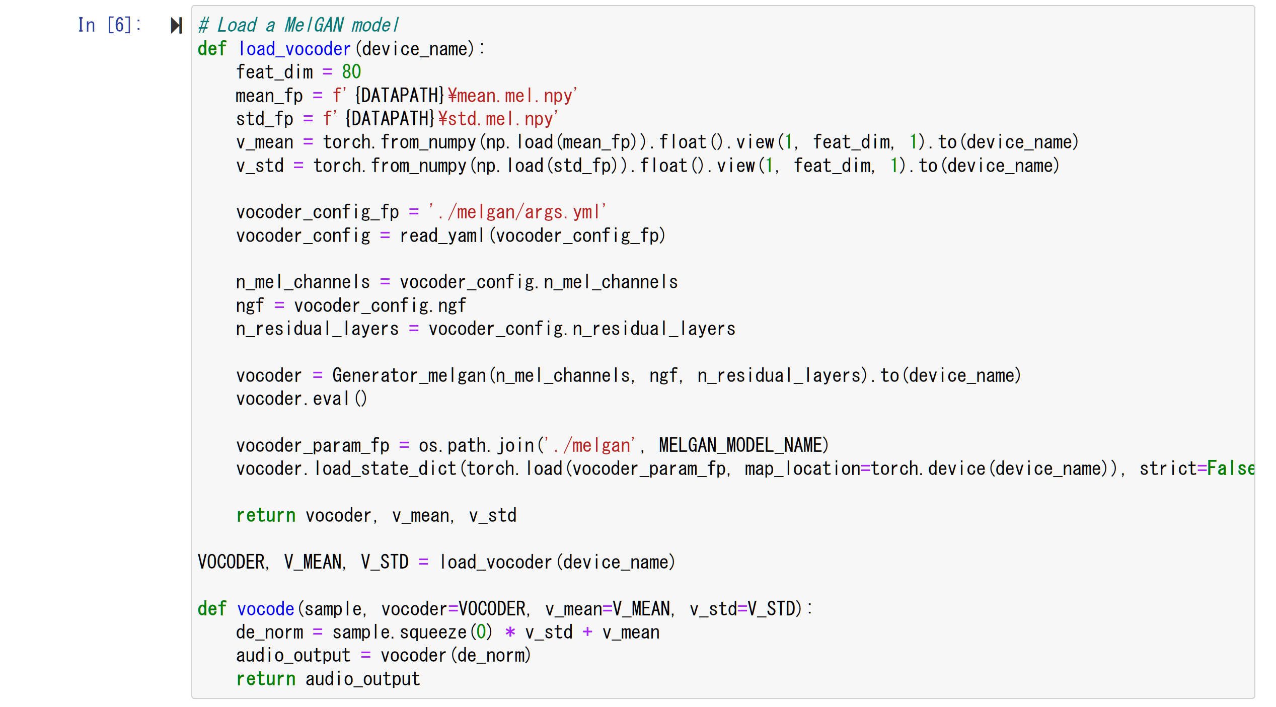 これはPytorchを使って実装されていますが、GPU(cuda)なしのPCでも動作するようにオリジナルから改変が加えられております。(素晴らしい! なぜならnVIDIAのグラボ必要になるのと、グラボがあっても安価なものだとcudaのメモリ不足で動かないようなことがあるから。音声ということで比較的データが軽いのと、短いデータなら問題なし)