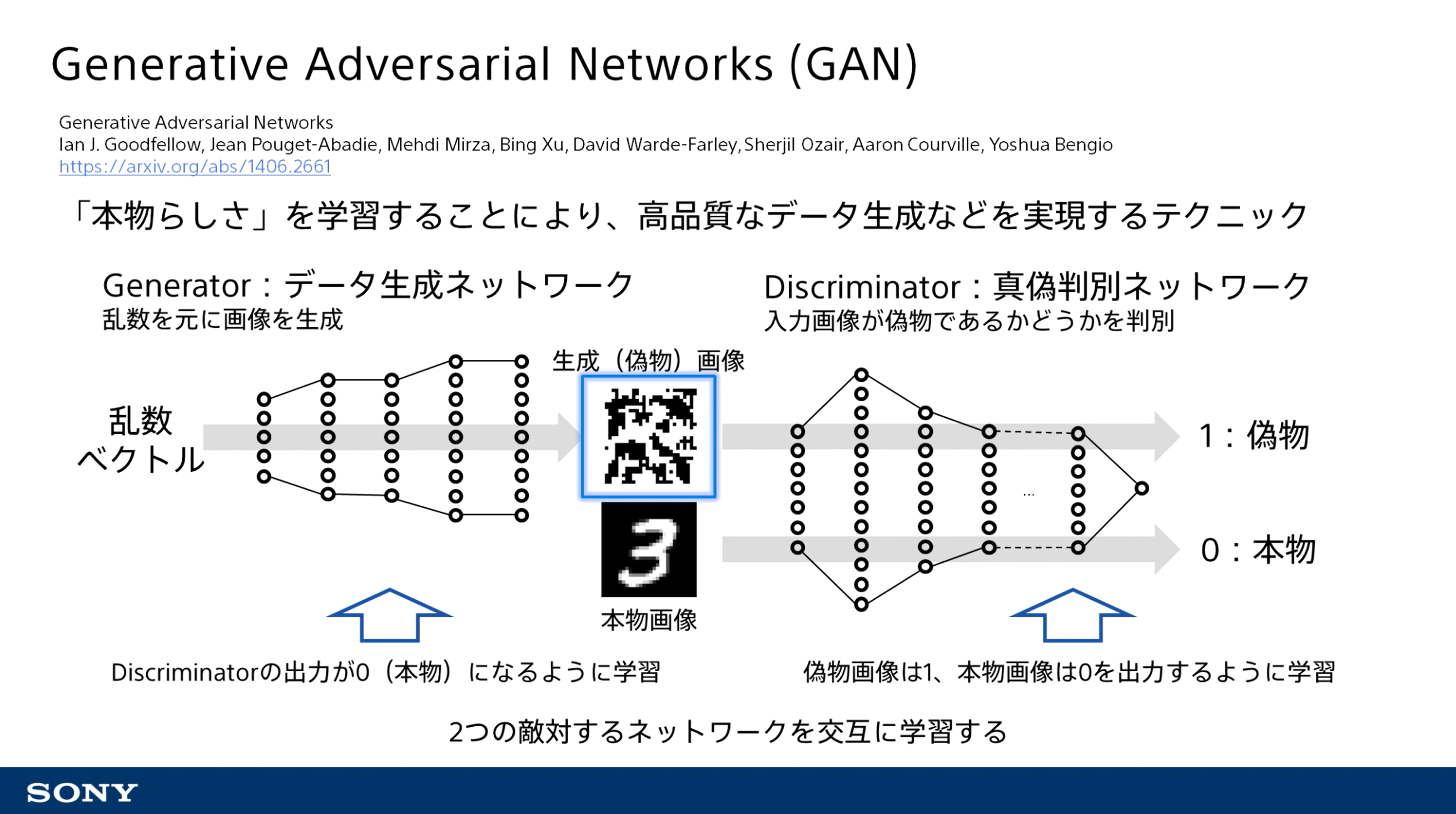 ポイントは、GeneratorとDiscriminatorという二つのネットワークを直列につなぐ構成で、本物画像を学習させるときは、Discriminatorだけつかい、そのDiscriminatorのパラメータを固定してランダムベクトルから生成した偽物画像をGeneratorに学習させるということを交互に実行するところでしょうか。
