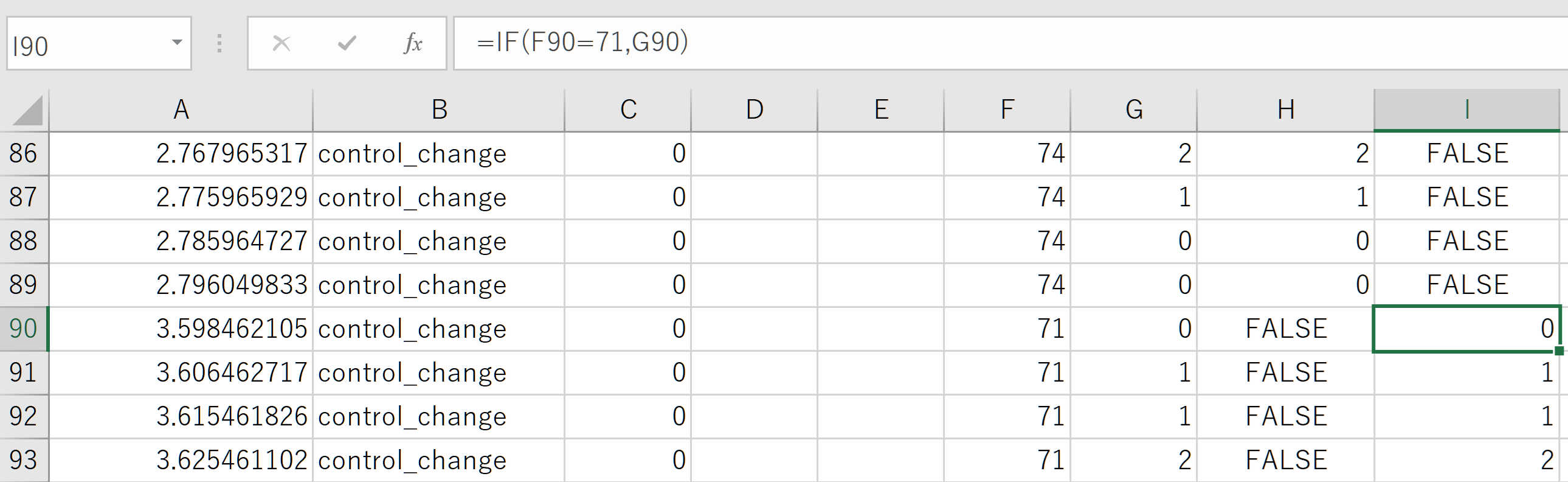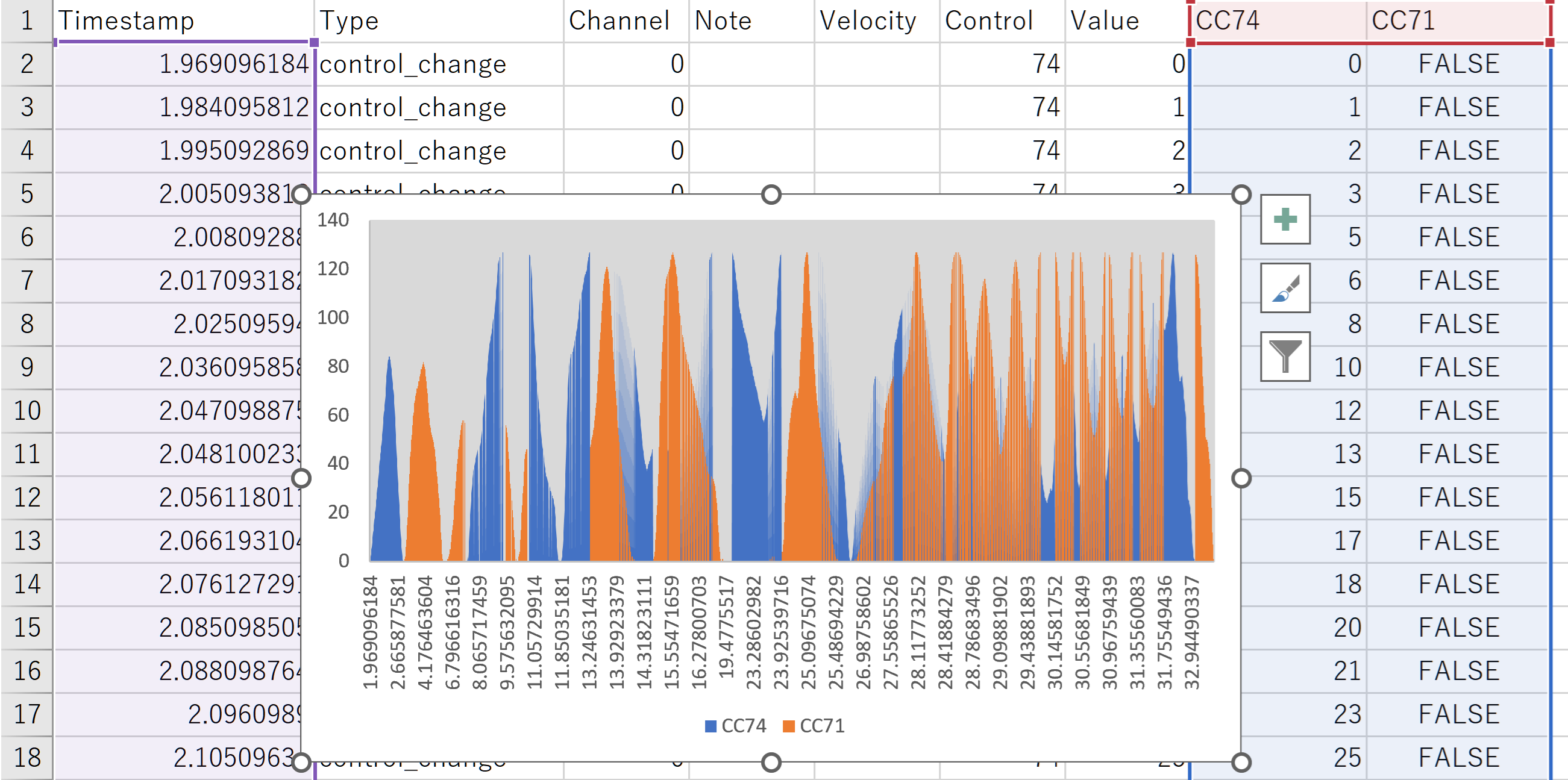 下記、CSVファイルをエクセルで編集してフィルタとレゾナンスのコントロールチェンジを可視化した。