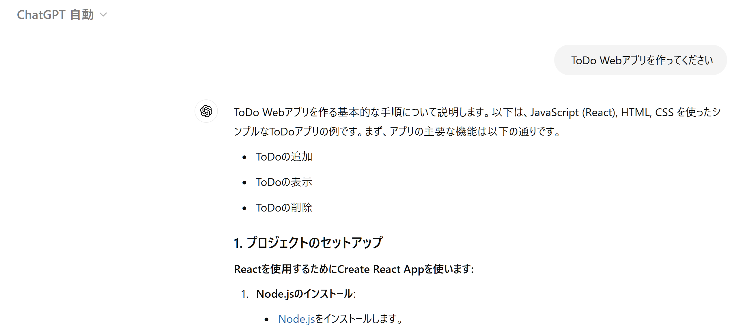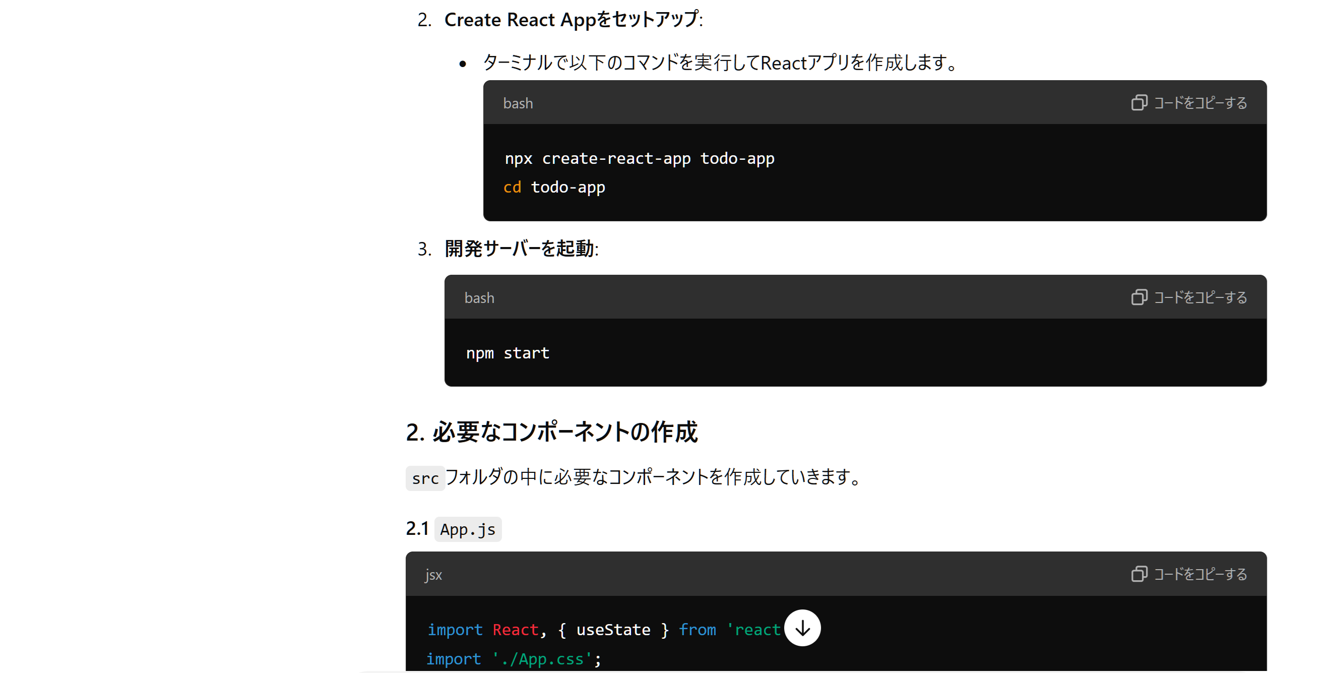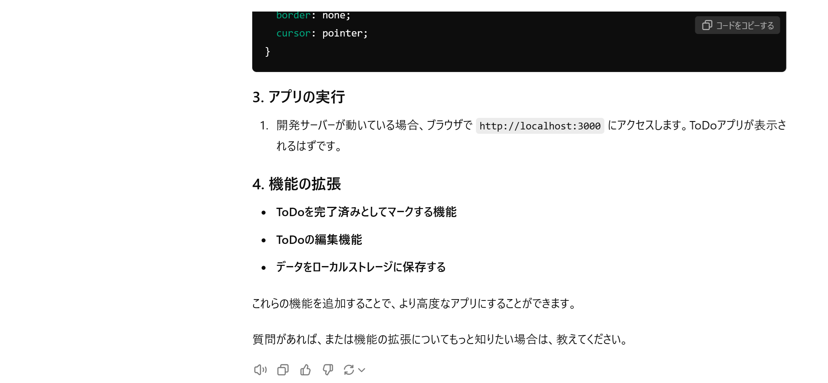 何も指定せずに生成しましたが、違うライブリにする場合はそのように指示すれば作りかえてくれます。Reactデフォルトで生成してくるということは、それだけ主流ということでしょう。