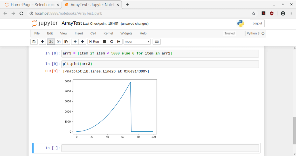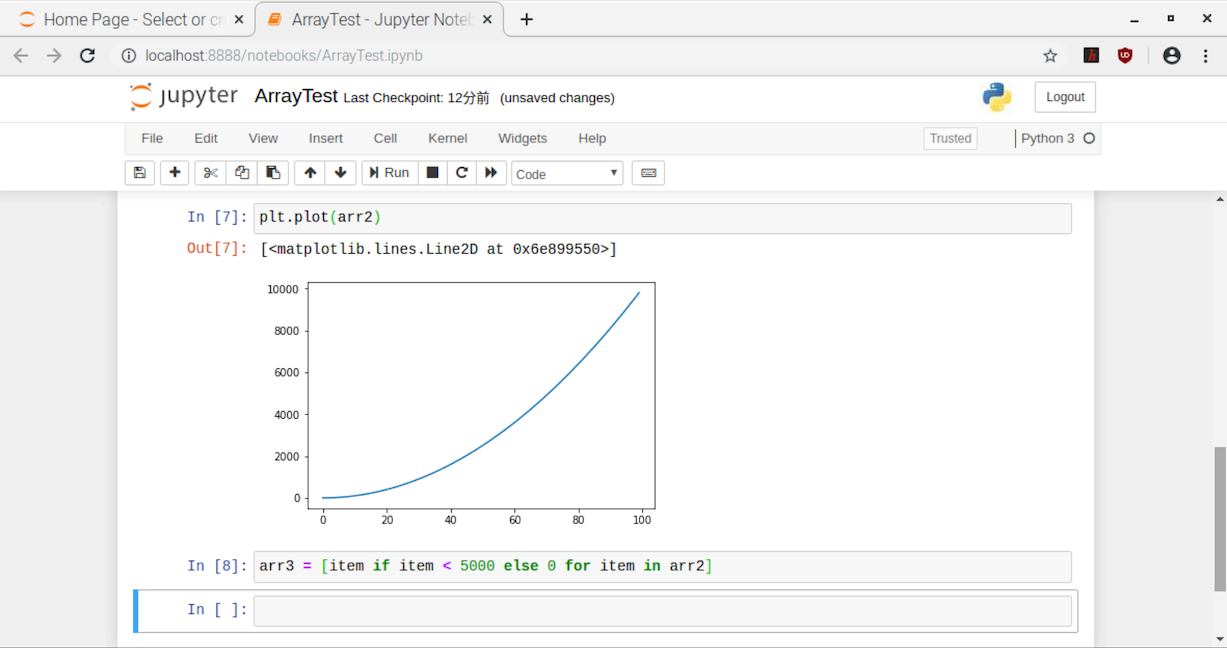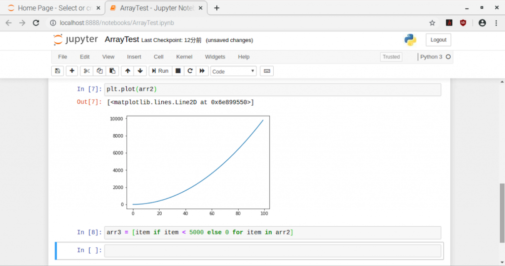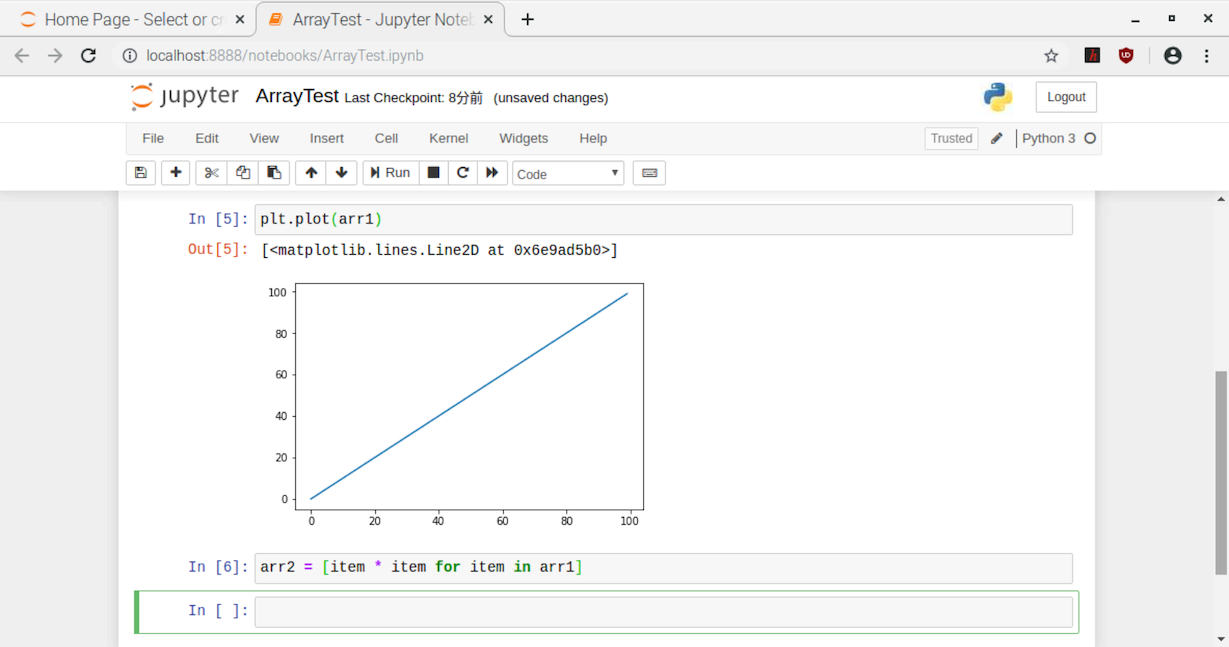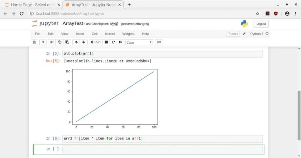 In[6]では、データを2乗しました。ここで注目は、配列のデータの演算にループ構文を作って、その中で計算をしていないことです。配列を一つずつ取り出した結果を演算対象にすることを式として表しています。(イテレータといいます)