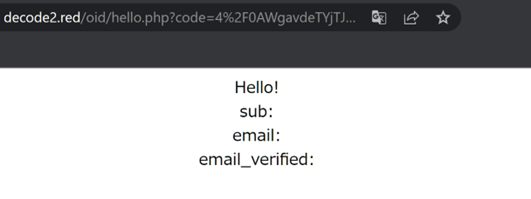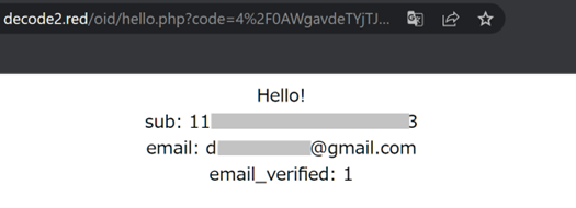 <?PHP $url = "https://accounts.google.com/o/oauth2/token"; $client_id = "44********.apps.googleusercontent.com"; $client_secret = "GOCSPX-*******"; $redirect_uri = "http://decode2.red/oid/hello.php"; $query = ""; $query .= "code=" . urlencode( $_GET["code"] ) . "&"; $query .= "client_id=" . urlencode( $client_id ) . "&"; $query .= "client_secret=" . urlencode( $client_secret ) . "&"; $query .= "redirect_uri=" . urlencode( $redirect_uri ) . "&"; $query .= "grant_type=" . urlencode( "authorization_code" ); $header = array( "Content-Type: application/x-www-form-urlencoded", "Content-Length: ".strlen($query) ); $context = array( "http" => array( "method" => "POST", "header" => implode("\r\n", $header), "content" => $query ) ); $res_json = file_get_contents( $url, false, stream_context_create($context) ); $res = json_decode($res_json); $val = explode(".", $res->id_token); $data_json = base64_decode($val[1]); $data = json_decode($data_json); echo("<center> Hello! <br>"); print( "sub: ". $data->sub ."<br>" ); print( "email: ". $data->email."<br>"); print( "email_verified: " . $data->email_verified); echo("</center>"); ?> |