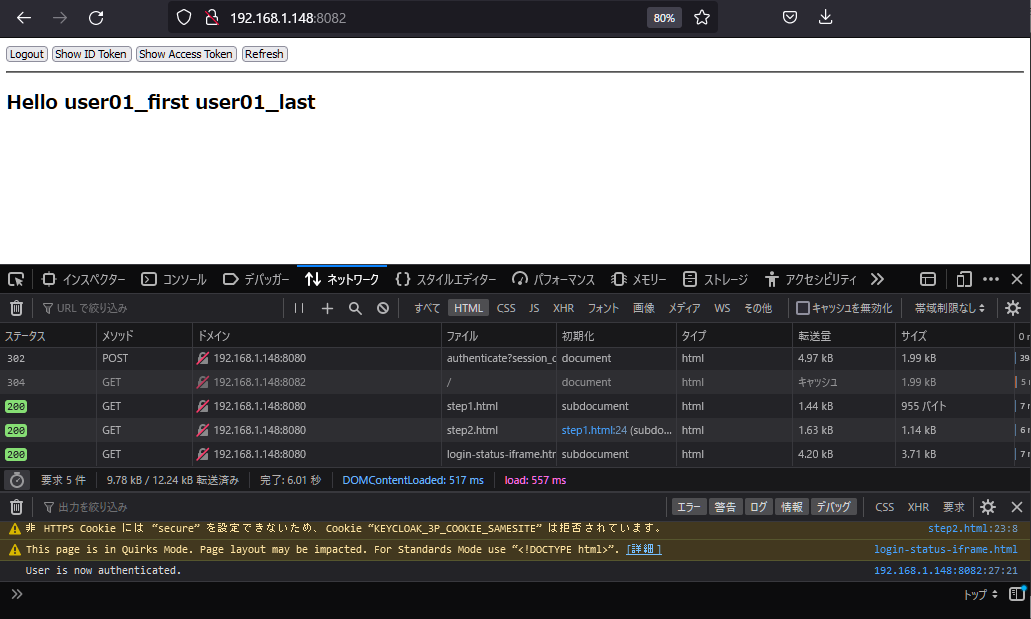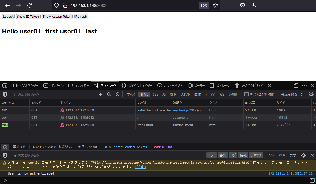 (コメントは、オリジン間リソース共有 (Cross-Origin Resource Sharing, CORS) のエラーがでたときに追加。しかしNG。Keycloakの設定で解決できることがわかる。一応残しておく)