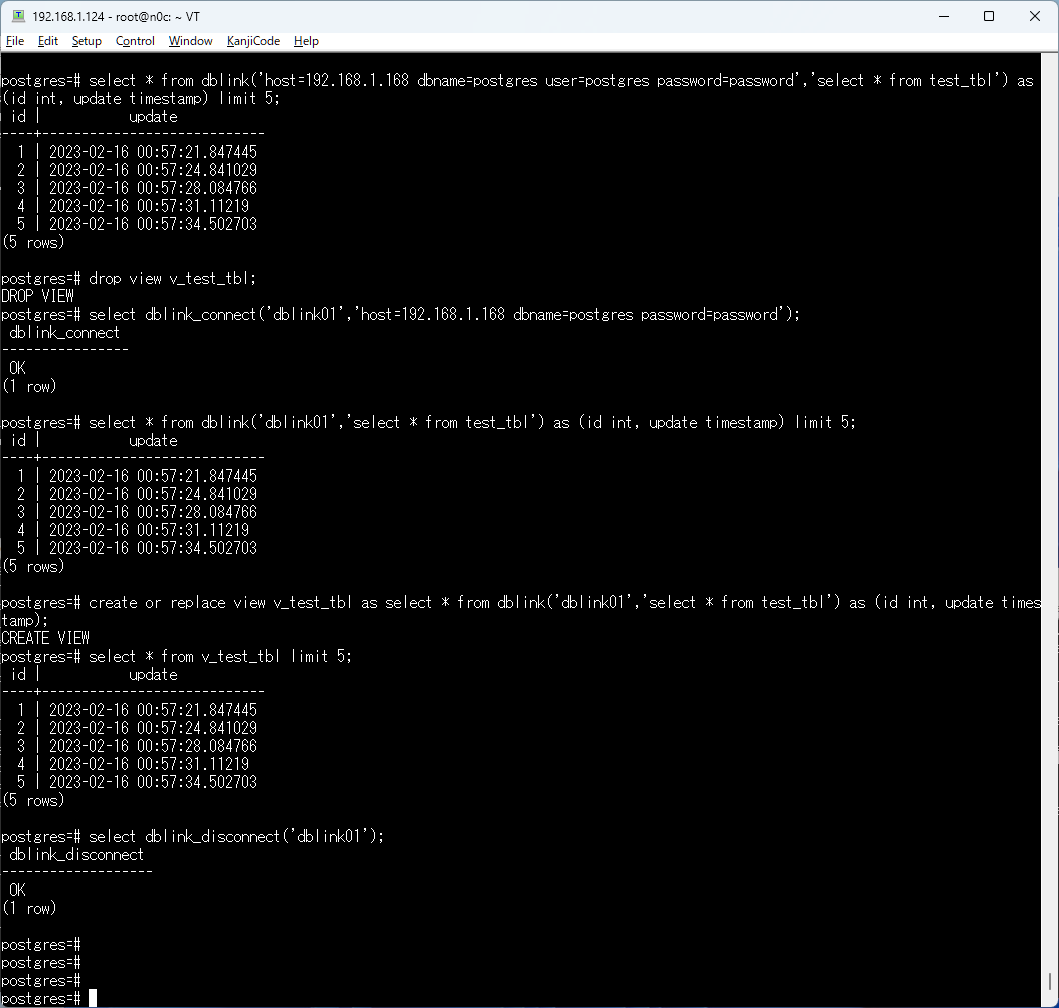 select * from dblink('host=192.168.1.168 dbname=postgres user=postgres password=password','select * from test_tbl') as (id int, update timestamp); select dblink_connect('dblink01','host=192.168.1.168 dbname=postgres password=password'); select * from dblink('dblink01','select * from test_tbl') as (id int, update timestamp); create or replace view v_test_tbl as select * from dblink('dblink01','select * from test_tbl') as (id int, update timestamp); select * from v_test_tbl; select dblink_disconnect('dblink01'); |