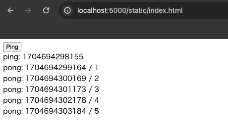 今回確認したかった、1秒ごとにpongが順に表示されることですが、複数ブラウザを立ち上げて同時に実行しても問題なく動作しました。