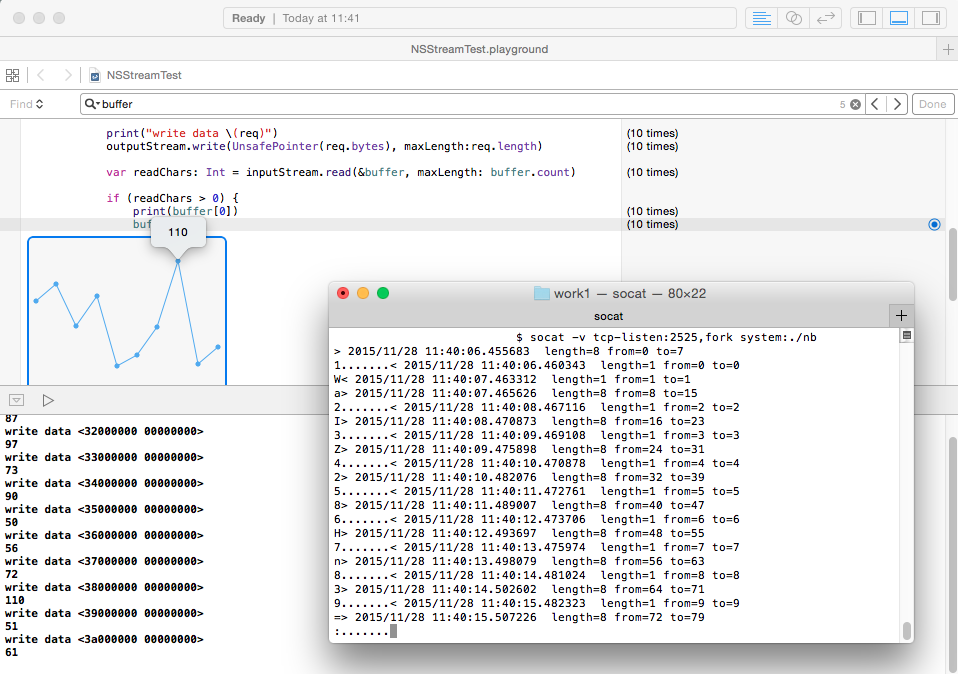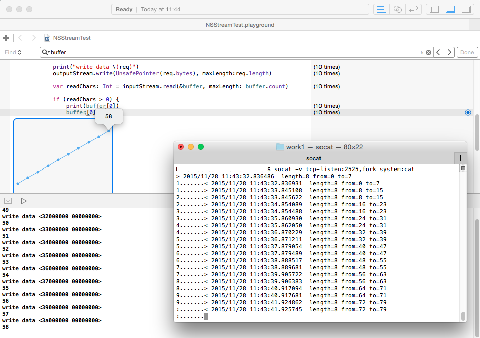 サーバはとても多機能なネットワークツールのsocatコマンドをMacのコンソールで走らせ、クライアントはPlaygroundからNSStreamを使いました。