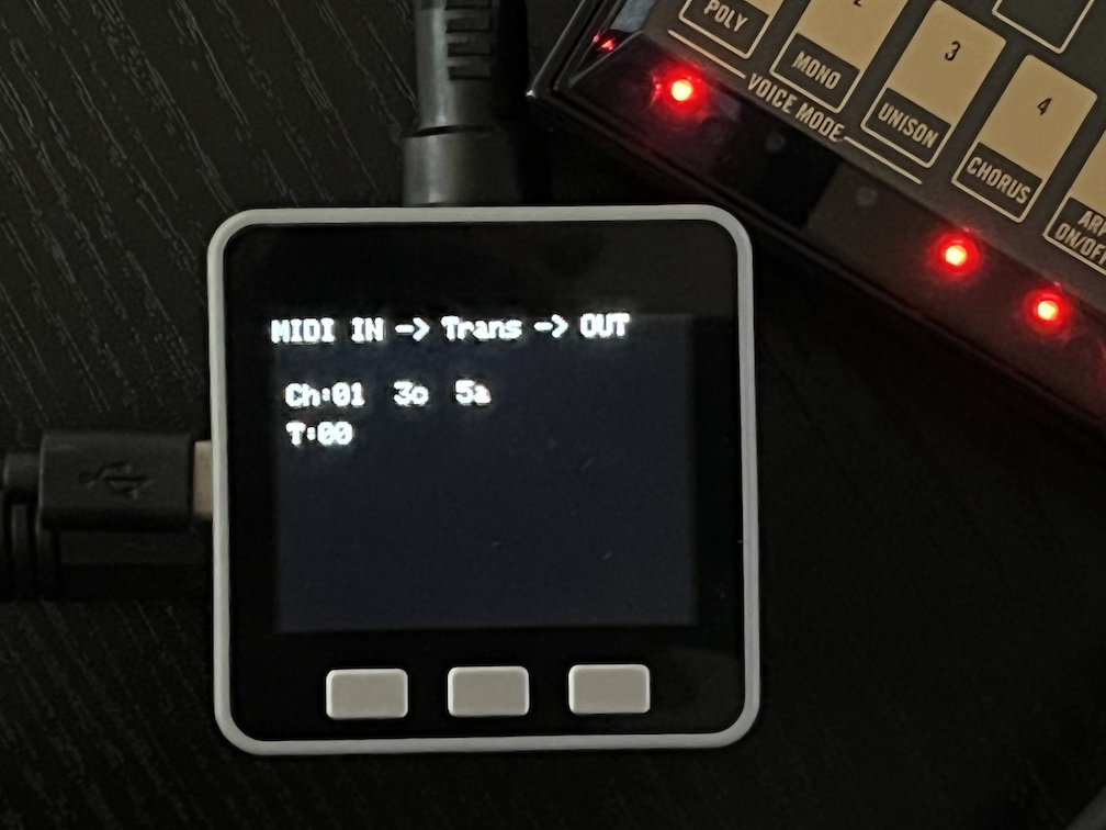 MIDIメッセージのトランスポーズ(転調)をするものですが、こういうのをPCでやると機能の割に大袈裟なことになってしまうため、このような小型デバイスが重宝します。