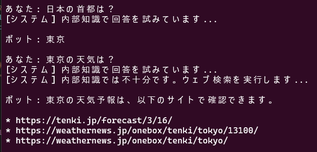 LLMをつかったチャットボットで、内部知識にない場合ネットに検索にいき、表示するデモをつくりました。