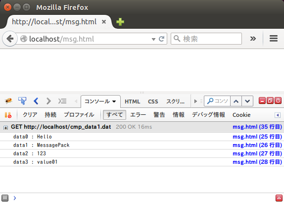 C言語でデータを作成したMessagePackデータを、Apache Webサーバに配置して、ブラウザで読み込みます。