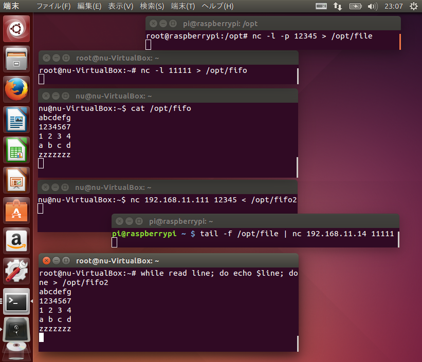 5) tail -f /opt/file | nc 192.168.11.14 11111 #Ubuntuに送信