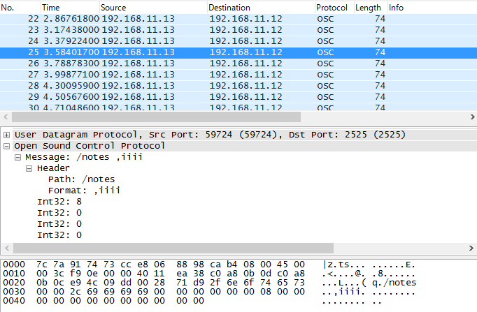 ‘/notes’がパラメータで、iiiiがデータフォーマットになります。送信側からはデータ1,5,8(do,mi,so)の繰り返し送り続けています。(UDP通信)